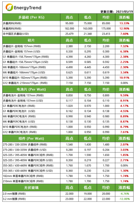多晶硅片方面,近期多晶中效片资源供应较紧缺,推动海内外整体成交均价抬升至2.2元/W和0.3美元/W,预计报价涨势并未停歇。