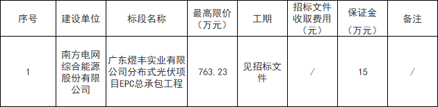 广东煜丰实业有限公司分布式光伏项目,已由项目审批机关批准,项目资金来源为自筹资金,招标人为南方电网综合能源股份有限公司。本项目已具备招标条件,现进行公开招标。