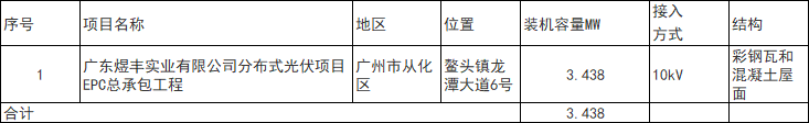 7月1日,广东煜丰实业有限公司分布式光伏项目EPC总承包工程招标公告,招标公告显示,本批项目EPC总承包工程总计3.438MWp,投标方负责采购“除晶体硅太阳能光伏组件外”所有的配套设备及相关材料。