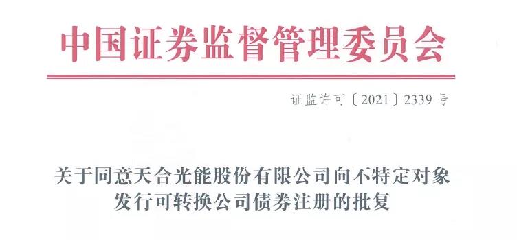2021年7月13日,天合光能股份有限公司在上海证券交易所网站披露公告,公司于近日收到中国证券监督管理委员会出具的《关于同意天合光能股份有限公司向不特定对象发行可转换公司债券注册的批复》,批复文件正式同意公司向不特定对象发行可转换公司债券的注册申请。