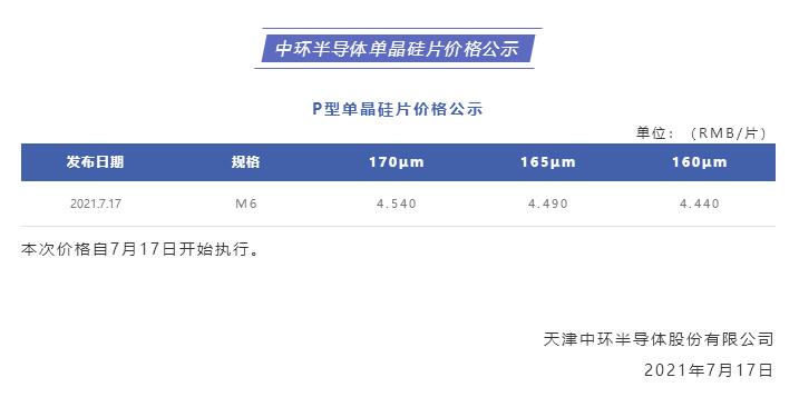 7月17日,中环股份再次下调166mm尺寸硅片价格至4.44~4.54元/片。