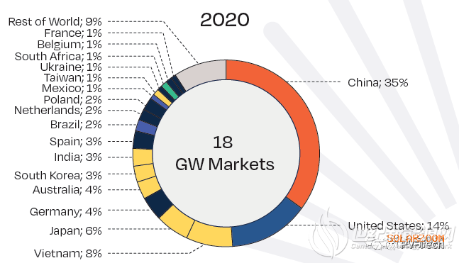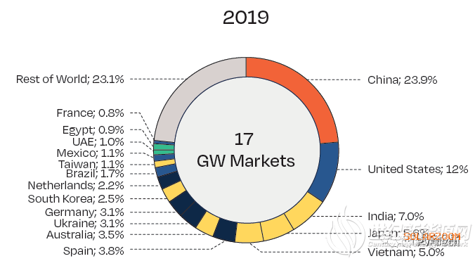 排名第二的是美国,其增长率较2019年翻了一番,达到43%,新开发量为19.2GW。据称,由于屋顶项目受到COVID-19疫情的影响,该国太阳能行业的增长几乎全部归功于公用事业部门。