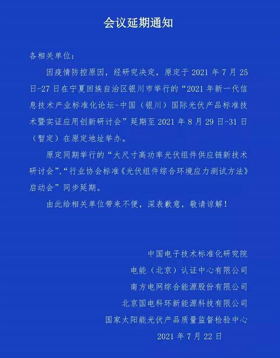 因疫情防控原因,经研究决定,原定于2021年7月25日-27日在宁夏回族自治区银川市举行的“2021年新一代信息技术产业标准化论坛-中国(银川)国际光伏产品标准技术暨实证应用创新研讨会”延期至2021年8月29日-31日(暂定)在原定地址举办。