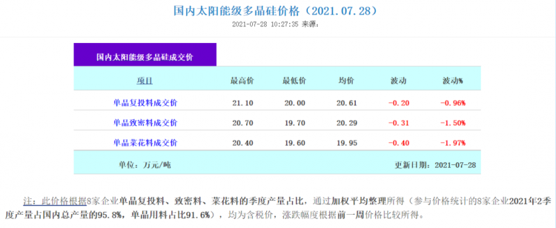 7月28日,中国有色金属工业协会硅业分会发布消息,多晶硅价格延续缓跌走势,最大跌幅近2%。