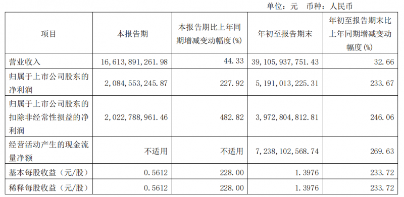 报告显示,第三季度公司实现营业收入16,613,891,261.98元,同比增长44.33%,归属于上市公司股东的净利润2,084,553,245.87元,同比增长227.92%,基本每股收益0.5612元/股,同比增长228%。