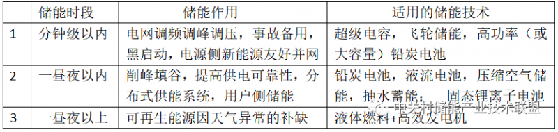 可以将储能时段划分为分钟级以内、一昼夜以内、一昼夜以上等三个时段,其相应的需求和适用的技术归纳于下表。