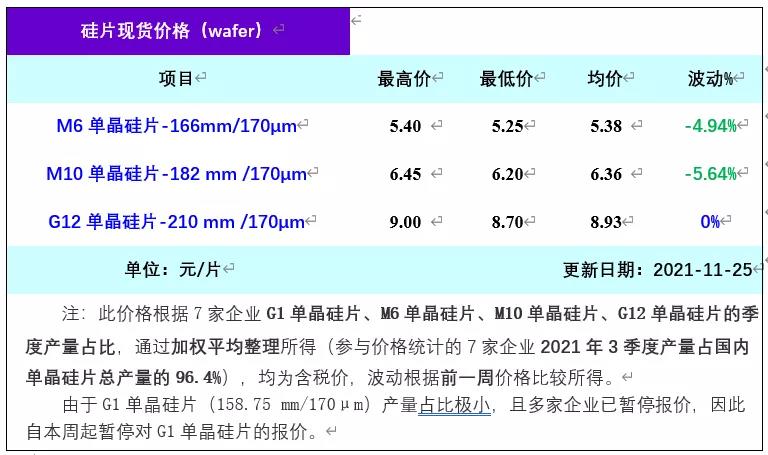 M6单晶硅片(166mm/170μm)价格区间在5.25-5.40元/片,成交均价降至5.38元/片,周环比跌幅4.94%;