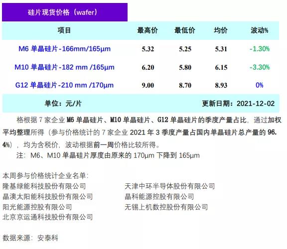 本周M6单晶硅片(166mm/170μm)价格区间在5.25-5.40元/片,成交均价降至5.38元/片,周环比跌幅4.94%;M10单晶硅片(182 mm /175μm)价格区间在6.20-6.45元/片,成交均价降至6.36元/片,周环比跌幅5.64%;G12单晶硅片(210 mm/170μm)价格区间在8.70-9.00元/片,成交均价维持在8.93元/片,周环比持稳。