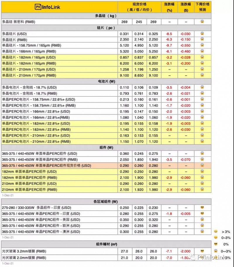 海外地区价格暂时稳定,当前主要以前期交付订单执行为主,再加上临近圣诞节、欧美地区拉货已经趋缓,海外终端也观察到供应链正处于下行趋势,当前执行价格仍在每瓦0.275-0.28元美金的区间,价格开始下行更加剧厂家对明年价格期望调整,一季度价格预期恐将来到每瓦0.27元美金的区间。