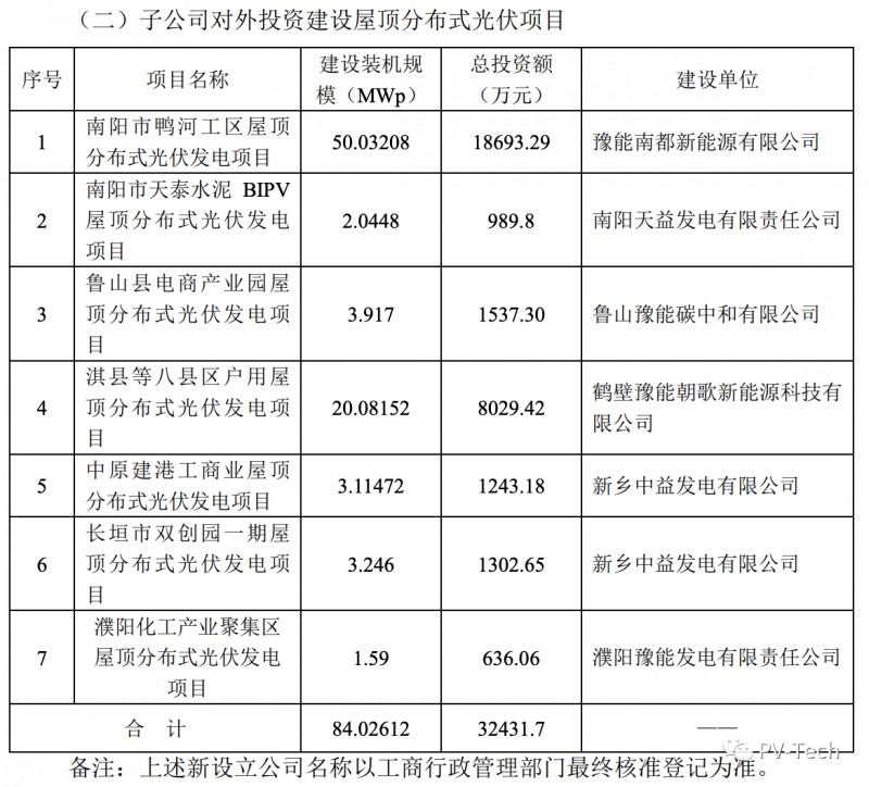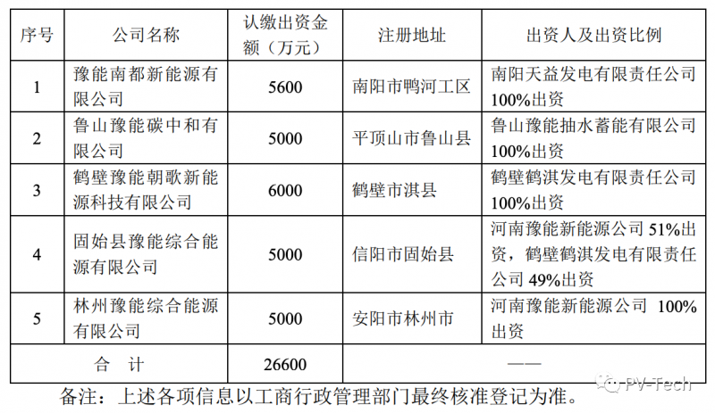 公司子公司天益发电、鲁山豫能、鹤淇发电、豫能新能源拟分别在南阳市鸭河工区、平顶山市鲁山县、鹤壁市淇县、信阳市固始县、安阳市林州市投资设立豫能南都新能源有限公司等5个整县屋顶分布式光伏项目公司,认缴出资额共计2.66亿元。