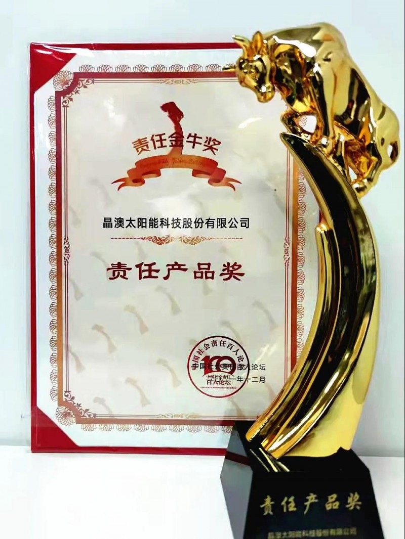 凭借着在产品技术方面的优势,及在推动全球绿色能源变革中的贡献,晶澳科技荣获2021年“责任金牛奖”之“责任产品奖”。这是自2019年以来,晶澳科技第三次荣获“责任金牛奖”。