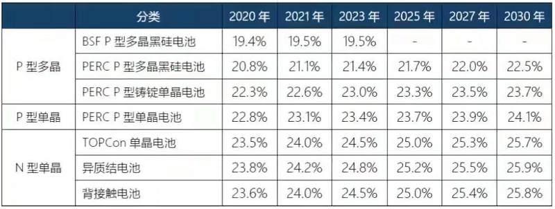 P型电池主要有BSF电池和PERC电池两种,2015年之前,BSF电池占了总市场的90%,是绝对的主流。2016年之后,PERC电池接棒起跑,到2020年,PERC电池在全球市场中的占比已经超过85%,BSF电池淘汰出局。在此期间,电池转换效率从不足20%提升到超过23%。