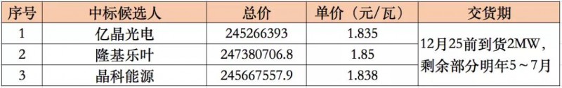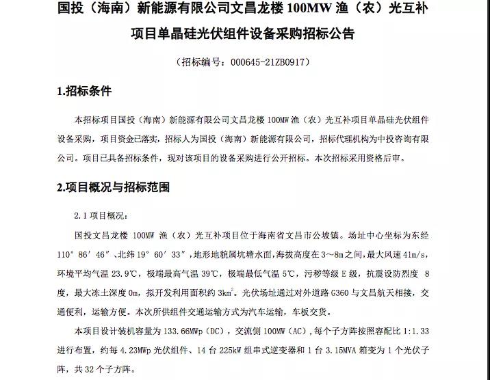 12月17日,国投(海南)新能源有限公司公示了文昌龙楼100MW渔(农)光互补项目光伏组件采购中标候选人,亿晶光电以1.835元/瓦的最低价位列第一中标候选人。