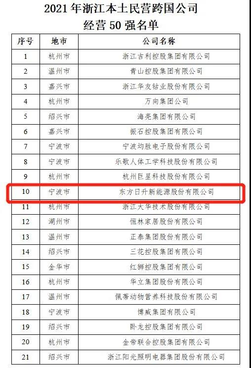 近日,2021年浙江本土民营跨国公司经营50强榜单发布,东方日升新能源股份有限公司荣登第10位,较上年提升7位。