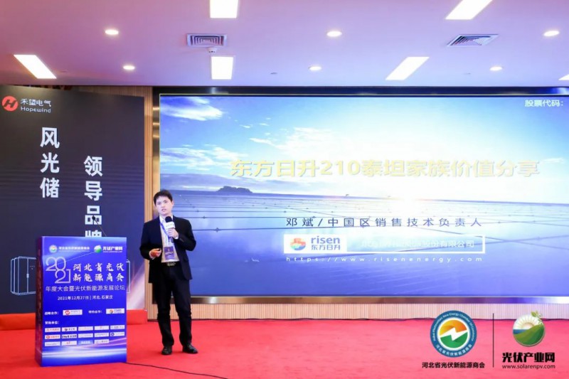 12月27日,由河北省光伏新能源商会主办的“第一届第六次会员代表大会”暨“2021光伏新能源发展论坛”在石家庄圆满落幕,大会邀请了商会、协会领导与知名新能源企业代表,对“整县推进”试点政策下2022年河北光伏发展进行前瞻展望。高功率组件技术领先企业东方日升受邀出席活动,中国区销售技术负责人邓斌以《东方日升210泰坦家族价值分享》为主题发表演讲,阐述210产品高效、绿色优势。
