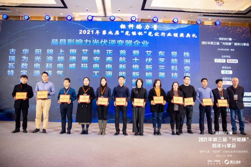 1月6日,由索比光伏网、光伏经销商联盟共同举办的“分布式光伏整县推进合伙人大会暨 2021 年‘光能杯’颁奖典礼”在苏州隆重召开。古瑞瓦特凭借突出的综合实力和市场影响力,摘得 “最具影响力光伏逆变器企业”桂冠,荣获“最具影响力光储解决方案企业”、“安装商推荐分布式/户用逆变器品牌”。