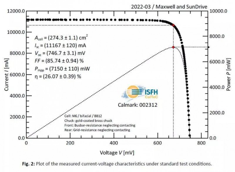 该效率较双方去年9月发布的25.54%提高了0.53%,认证电池的短路电流(Isc)、开路电压(Voc)和填充因子(FF)均得到了提升。该批次电池的PECVD工艺在迈为最新一代的量产微晶设备上完成,采用了双面微晶结构结合PVD新型高迁移率的TCO工艺。金属化工艺由SunDrive在其最新一代无种子层电镀中试设备上完成,在电镀速度以及栅线的高宽比方面进行了优化。