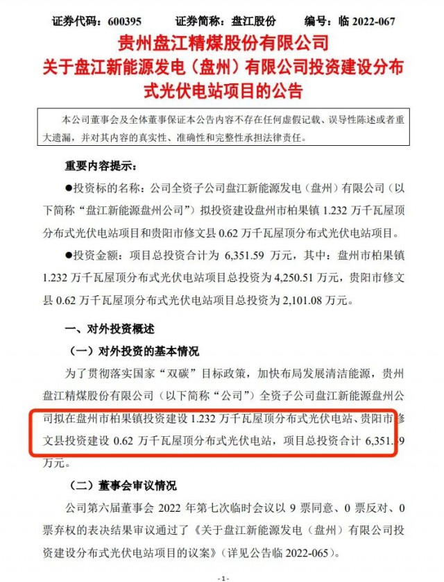 10月17日晚间,盘江股份(600395.SH)发布公告称,其全资子公司盘江新能源盘州公司拟在盘州市柏果镇投资建设1.232万千瓦屋顶分布式光伏电站、贵阳市修文县投资建设0.62万千瓦屋顶分布式光伏电站,项目总投资合计6351.59万元。