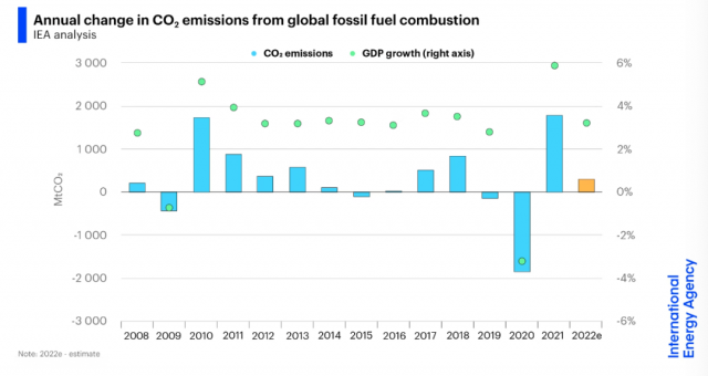 数据显示,2022年的排放量将增加近3亿吨,达到338亿吨,这主要是由发电行业和航空业推动的。去年,由于全球在从COVID-19引发的经济危机中迅速复苏,出现了近20亿吨的跳跃式增长。