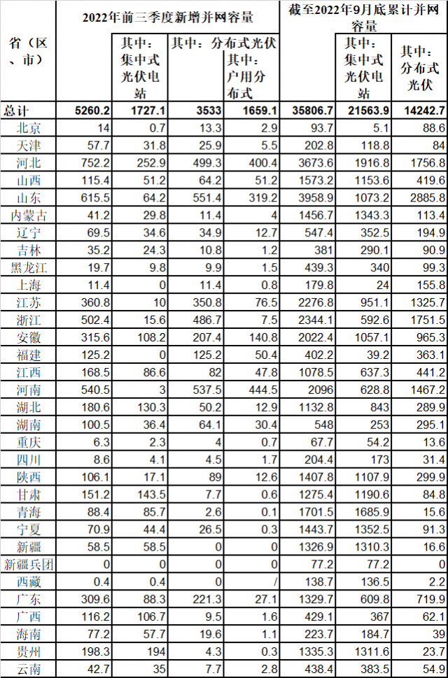 2022年前三季度光伏发电建设运行情况