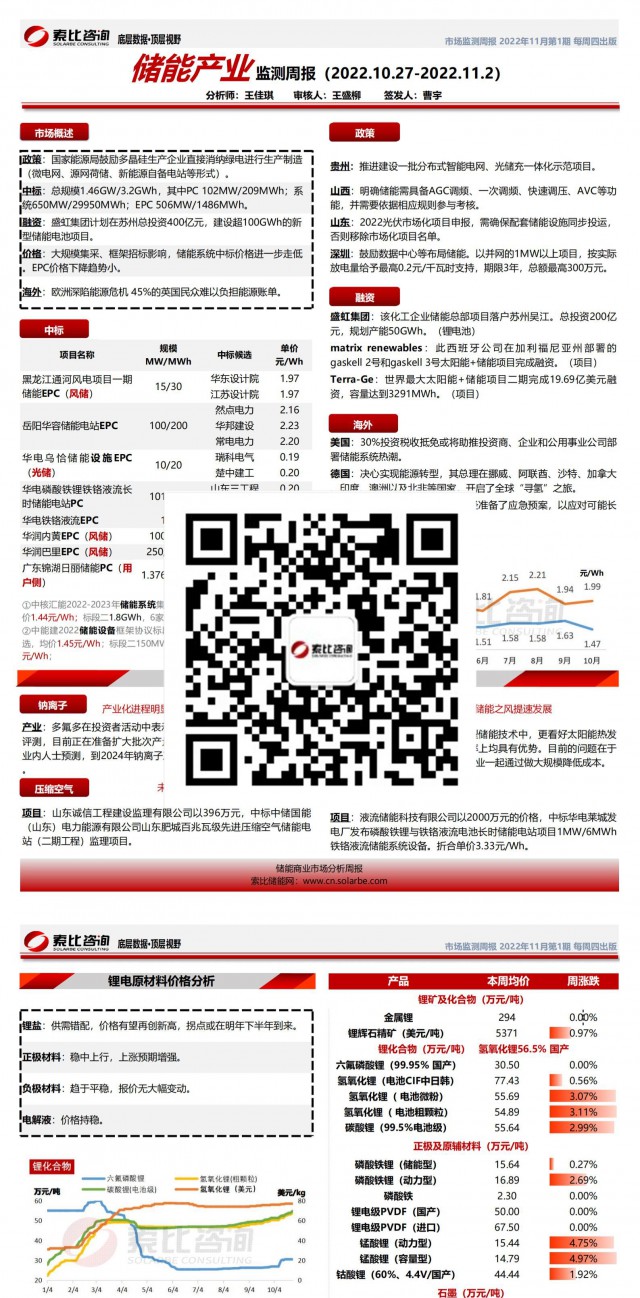 储能产业监测周报系索比咨询对于储能产业情况监测与分析。汇总分析政策、中标、抽蓄、融资、海外、技术等多方面内容,展现市场实时动态。另有锂电产业链价格跟踪,帮助企业获得价格参考,对后续市场趋势做出研判。