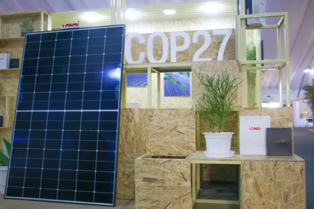 ■ 在COP27大会绿区企业主题展厅,隆基展出全新发布的Hi-MO 6光伏组件产品。