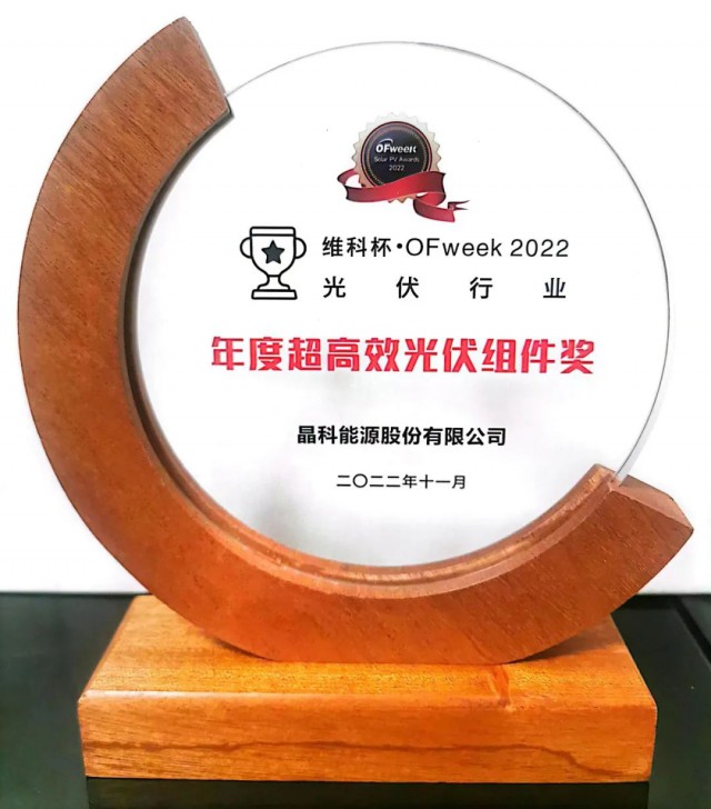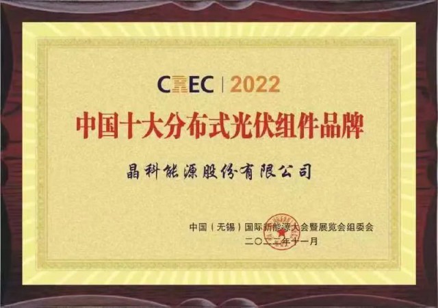 近日,由中国国际商会、江苏省贸促会和无锡市人民政府联合主办的第十四届中国(无锡)国际新能源大会暨展览会开幕。晶科能源作为光伏产业的龙头企业,参加了于11月17日举行的光伏产业生态圈会议暨2022全球光伏产业峰会,并收获了CREC2022“中国十大分布式光伏组件品牌”荣誉。有此殊荣,当与公司刚刚创造的182N型TOPCon电池组件最高转换效率达23.86%的新纪录相得益彰。