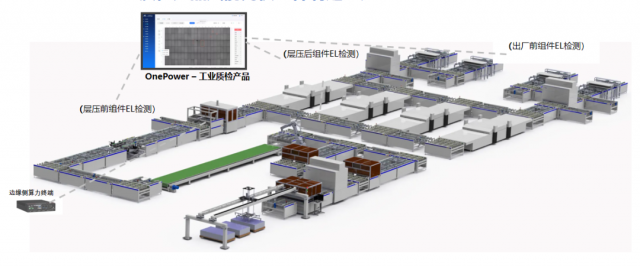 OnePower-IQI工业质检系统是面向光伏组件制造行业的智能检测产品。针对光伏电池组件生产质检,将基于深度学习的 AI 检测算法与 CV 视觉检测算法相结合,实现对组件产品多种缺陷的快速识别与精准检测,可大幅降低因漏检而产生的产品降级或报废带来的损失,同时还可以通过对产品缺陷分布情况进行大数据分析和溯源,为生产流水线提供故障预警、故障排查、工艺调整的建议和服务。效率的提升有利于组件质量的提高,为客户带来更稳固的利益保障。