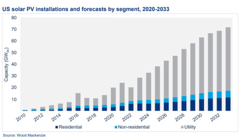 2020~2033年美国安装的光伏系统装机容量及细分市场预测
