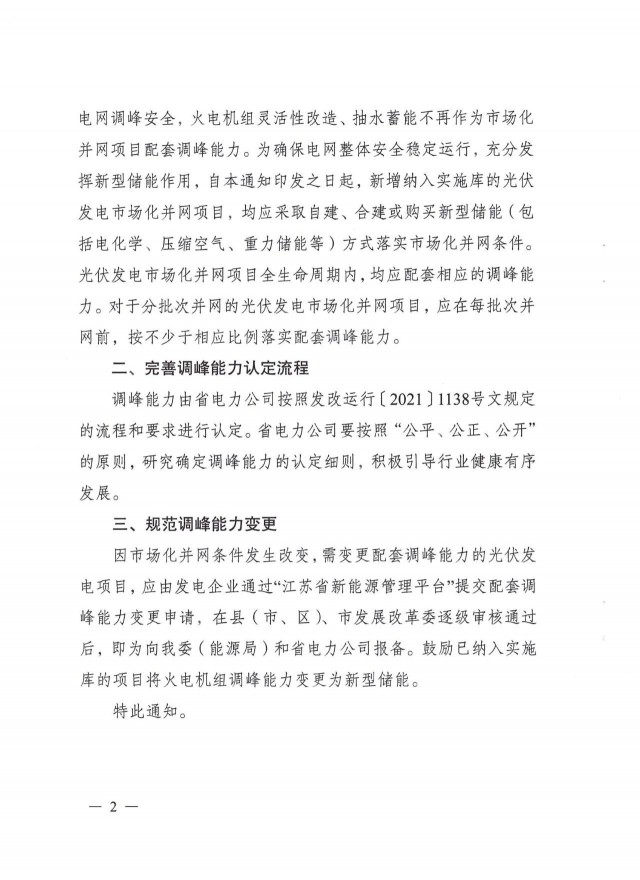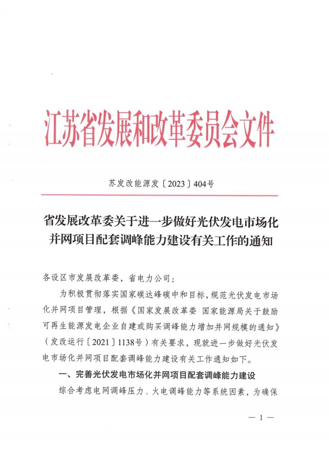 4月17日,江苏省发改委印发《省发展改革委关于进一步做好光伏发电市场化并网项目配套调峰能力建设有关工作的通知》(简称《通知》)。