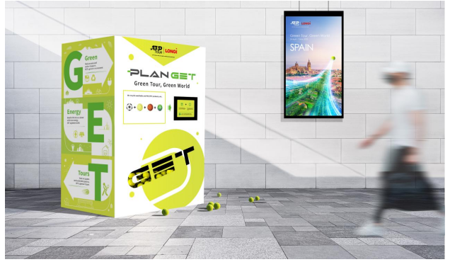 为了让绿色、环保的理念更好地触达现场观众,在马德里大师赛期间,隆基特意设立了绿色能源互动展示区。这个特别的展示区包含品牌互动区以及“PLAN GET专区”等板块。