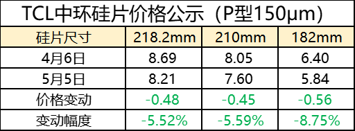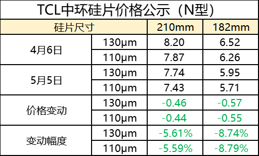 5月5日,TCL中环在官微平台发布了单晶硅片最新价格。与4月6日报价相比,不同尺寸硅片价格均有明显下降。其中,218.2mm、210mm硅片价格都有5.5%以上降幅,182mm硅片价格降幅超过8.7%。