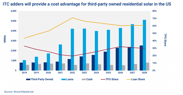 自从《削减通胀法案》(IRA)通过以来,开发商对住宅光伏系统在第三方所有权(TPO)领域的未来增长也有了更多的期望,因为可以获得投资税收抵免,而客户所有权的住宅光伏系统则没有投资税收抵免的资格。贷款市场持续动荡和第三方所有权(TPO)领域获得投资税收抵免的优势将导致住宅光伏系统的融资环境从今年开始发生转变。