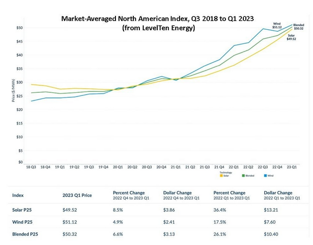 根据LevelTen公司在今年4月发布的一份研究报告,2023年第一季度,北美地区的平均电力采购协议价格上涨6.6%,其中光伏项目的电力采购协议价格上涨8.5%,风电项目的电力采购协议价格上涨4.9%。根据Edison Energy公司在2023年第一季度发布的全球可再生能源市场更新报告,在几乎所有市场和技术的衡量下,价格涨幅实际上可能高达11%。