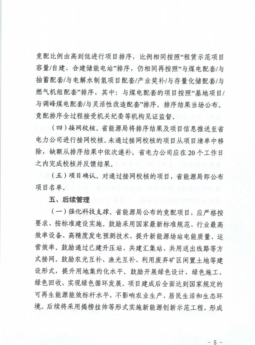 文件明确表示,根据项目的不同类型,按照20%/2小时(2.5小时)配置储能容量,作为基础条件。新能源项目在基础配储容量之外自愿提高配储比例,作为竞争条件,省能源局依据项目竞配比例从高到低安排新建项目。