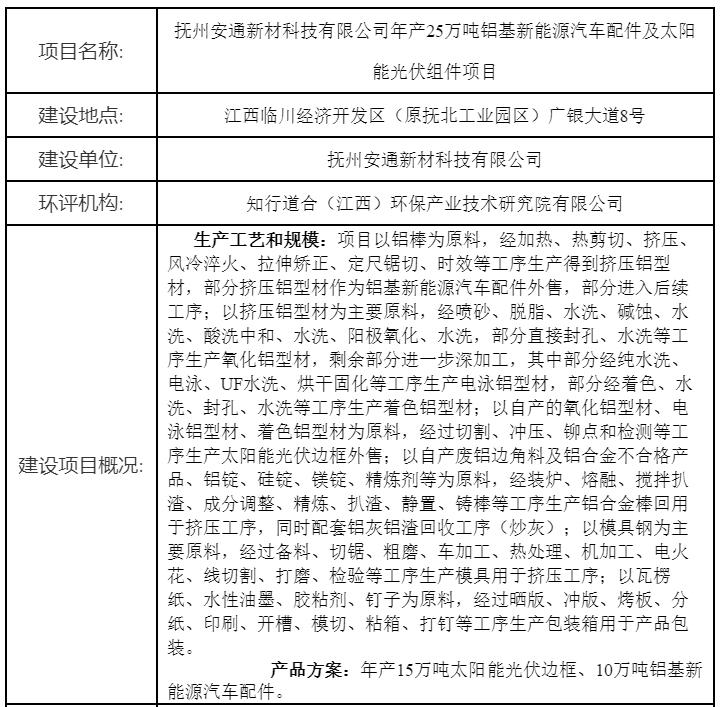 1月10日,江西省生态环境厅审核通过了“抚州安通新材料有限公司年产25万吨铝基新能源汽车配件及太阳能光伏组件项目”。