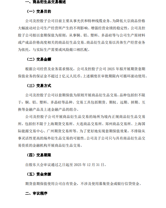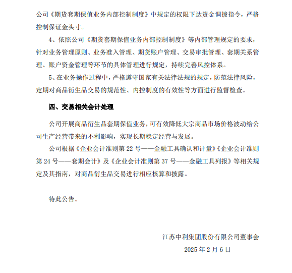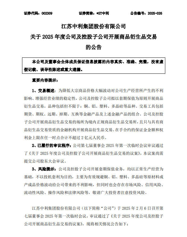 2月7日,江苏中利集团股份有限公司发布关于 2025 年度公司及控股子公司开展商品衍生品交易的公告。