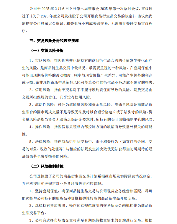 公司在第七届董事会 2025 年第一次临时会议审议通过了《关于 2025 年度公司及控股子公司开展商品衍生品交易的议案》。