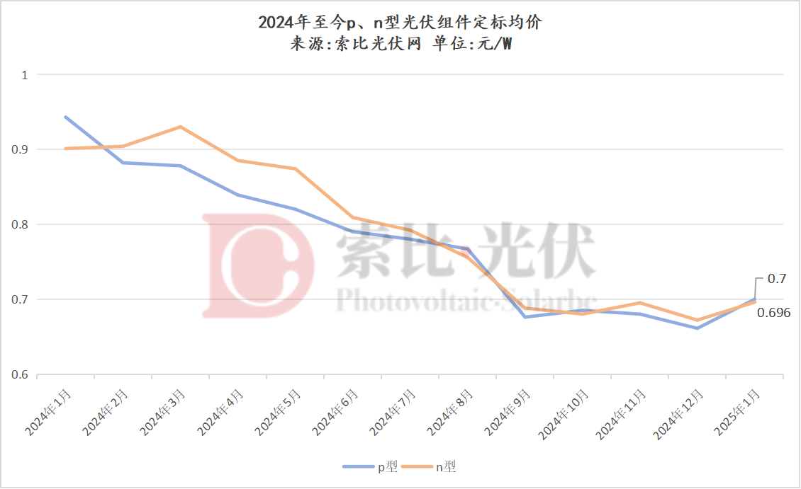 价格方面,2025年1月份n型组件中标均价0.696元/W,较上月涨幅3%左右;p型组件中标均价0.7元/W,较上月涨幅约6%。