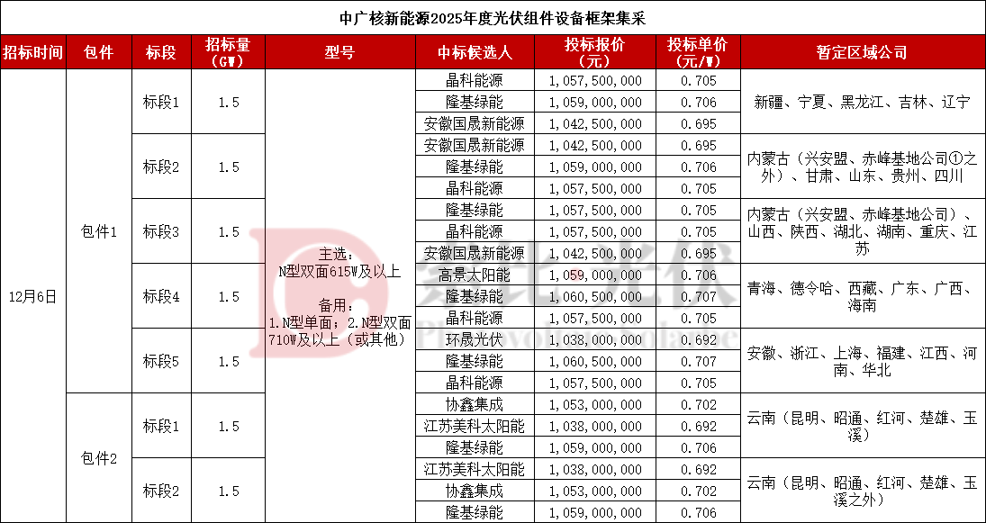 从已知公开的招标信息来看,1月份中广核有10.5GW光伏组件公开中标候选人。具体项目为中广核新能源2025年度光伏组件设备框架集采,集采划分为2个包件,共计分为7个标段,每个标段采购容量1.5GW,组件型号主选N型双面615W及以上,备用N型单面或N型双面710W及以上组件(或其他)。从各标段候选人来看,晶科能源、安徽国晟新能源、隆基绿能、高景太阳能、环晟光伏、协鑫集成、江苏美科太阳能7家企业拟各中标1.5GW。