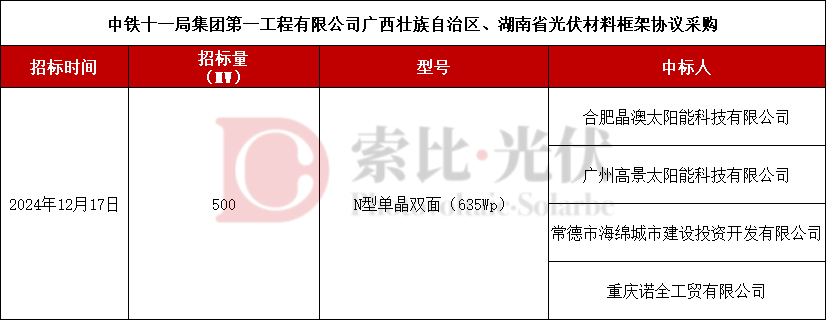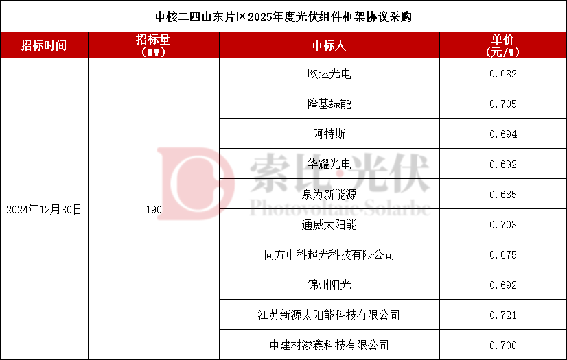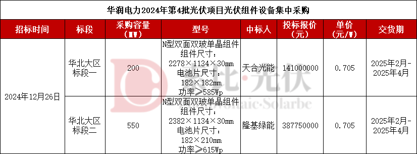 此外,在华润电力2024年第4批光伏项目光伏组件设备集中采购中,天合光能、隆基绿能分别以0.705元/W中标。