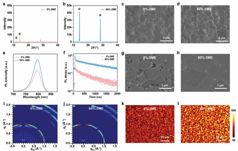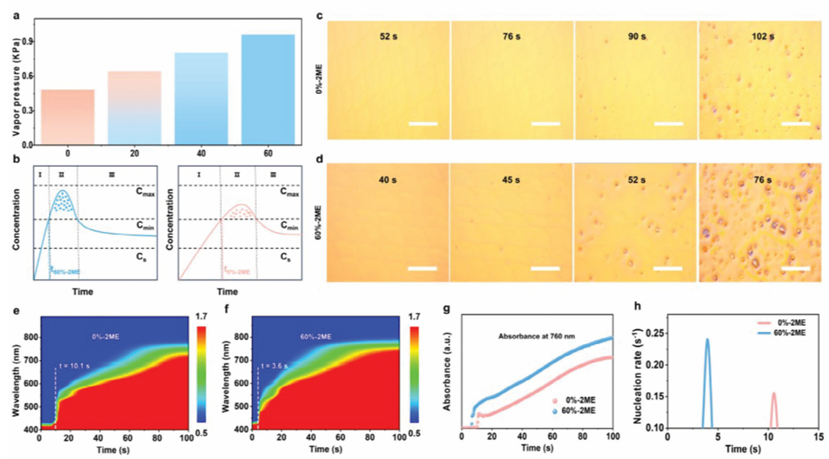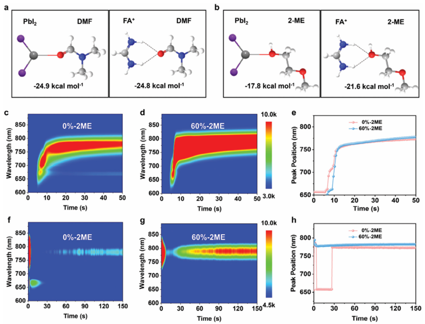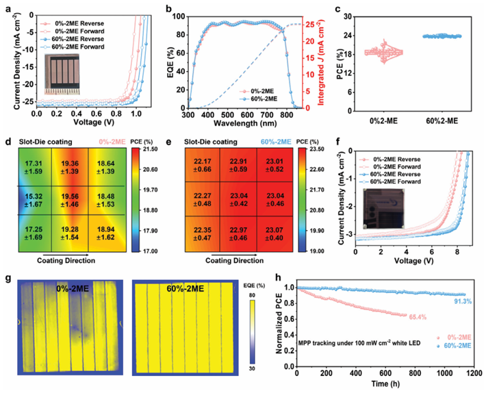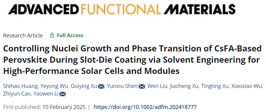 狭缝涂布已成为大规模生产钙钛矿太阳能电池 (pero-SC) 和太阳能模块 (pero-SM) 的必不可少的方法。然而,由于钙钛矿在成膜过程中结晶动力学不可控且相变复杂,狭缝模头涂层生产的钙钛矿太阳能电池和钙钛矿太阳能模组的能量转换效率仍然远远落后于旋涂器件。鉴于此,2025年2月10日苏州大学Guiying Xu&Yunxiu Shen&李耀文于AFM刊发通过溶剂工程控制狭缝模头涂层过程中CsFA基钙钛矿的核生长和相变以实现高性能太阳能电池和模组的研究成果,通过添加挥发性2-甲氧基乙醇(2-ME)并将其与DMF结合作为主要溶剂来设计钙钛矿前体溶液。其高蒸气压和Kamlet-Taft β值使其能够快速成核并与碘化甲脒形成氢键,促进高密度核的形成,从而模板均匀生长并直接触发α相钙钛矿的形成。因此,使用狭缝模头涂层法成功沉积了具有均匀、无针孔和纯相特性的高质量大面积(25 cm2)钙钛矿薄膜。最终,通过狭缝模头涂层制备的pero-SC(0.062 cm2)和pero-SM(15.64 cm2)分别实现了令人印象深刻的24.20%和21.84%的效率。值得注意的是,未封装的 pero-SC表现出优异的运行稳定性,T90>1150小时。