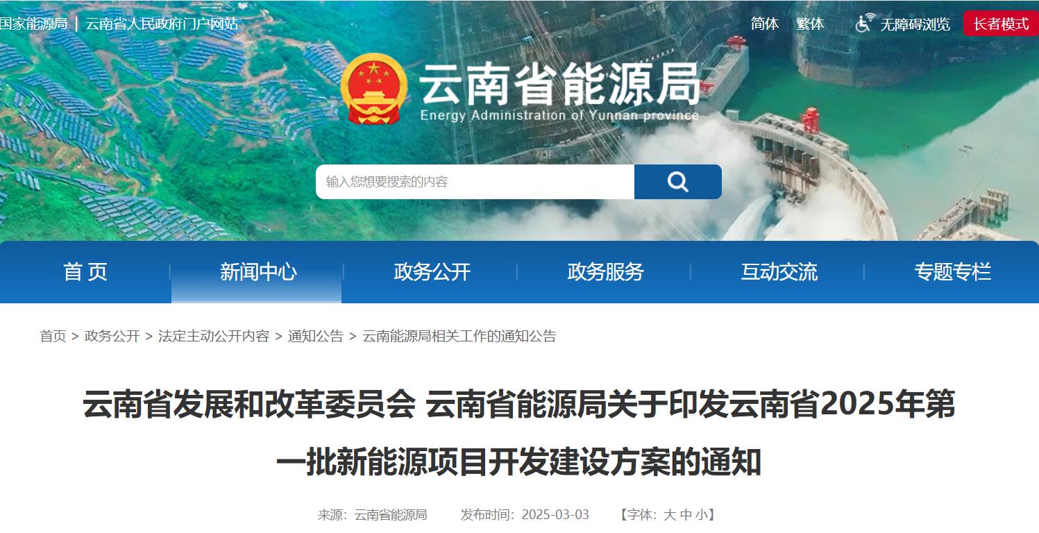 3月3日,云南省发展和改革委员会 云南省能源局发布关于印发《云南省2025年第一批新能源项目开发建设方案》的通知。