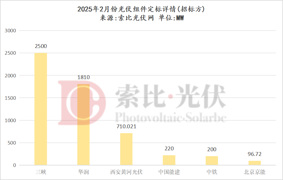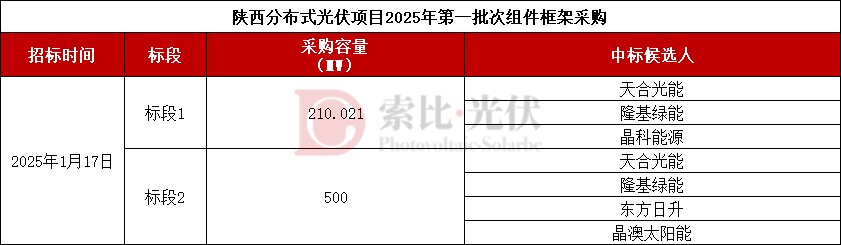 西安黄河光伏科技股份有限公司2月份组件定标710MW,招标项目为陕西分布式光伏项目2025年第一批次组件框架采购,最终由天合光能、隆基绿能、晶科能源、东方日升、晶澳太阳能5家企业中标。