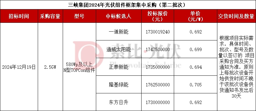 从已知公开的招标信息来看,2月份三峡有2.5GW光伏组件公开中标候选人。具体项目为三峡集团2024年光伏组件框架集中采购(第二批次),采购型号为N型TOPCon-580Wp及以上组件,由一道新能、通威太阳能、正泰新能、隆基绿能、东方日升5家企业入围。