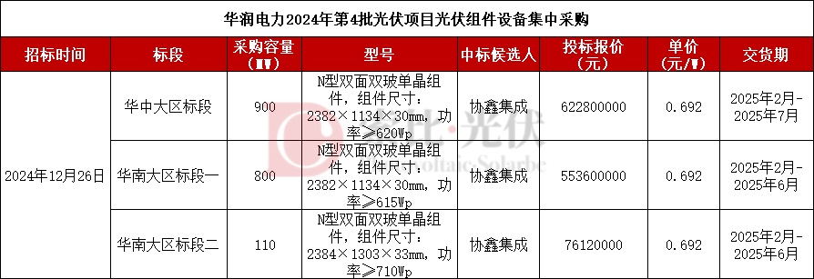 华润2月份组件定标1.81GW,招标项目为华润电力2024年第4批光伏项目光伏组件设备集中采购,三个标段均由协鑫集成中标,中标单价0.692元/W。