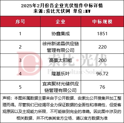 中标情况来看,2月份有约2.6GW组件明确公示了具体中标方和供货容量。从可查询到的公开数据来看,协鑫集成、高景太阳能、徐州新诺晶供应链管理有限公司、隆基乐叶等企业表现亮眼。