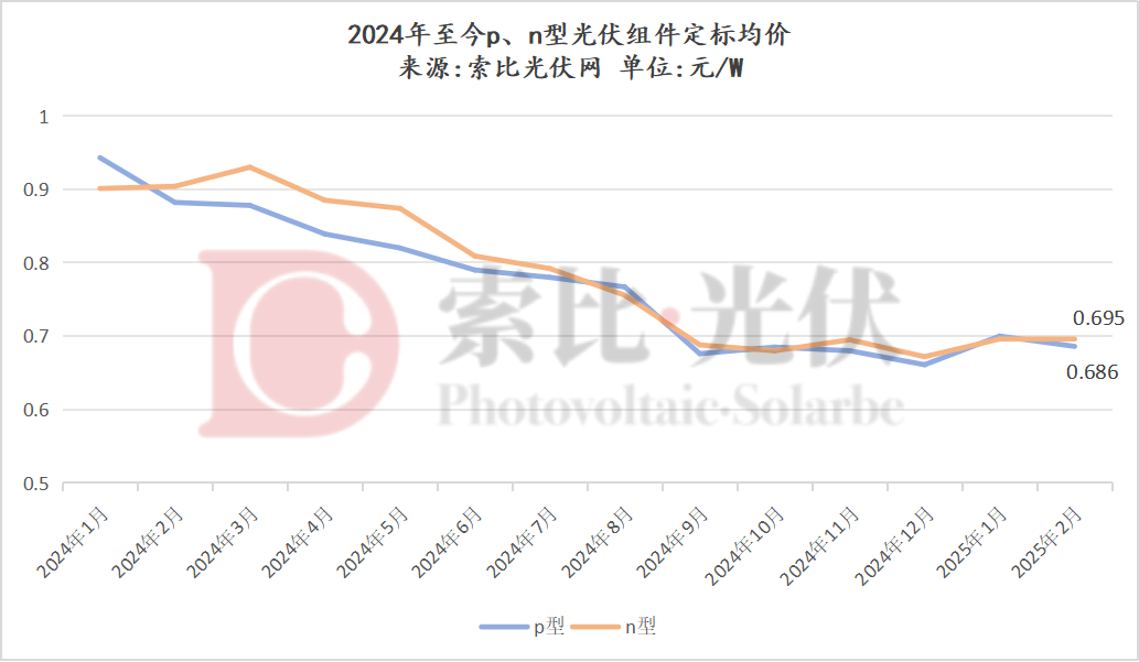 其中,n型组件2月份中标单价在0.648~0.71元/W,均价0.695元/W,p型组件2月份中标均价0.686元/W,组件价格较上月基本持平。