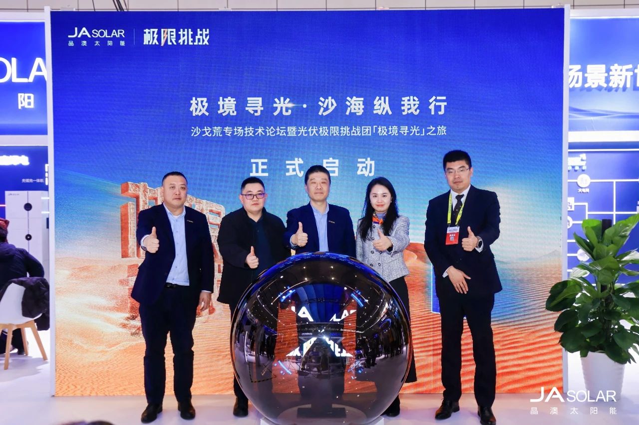 在本次济南展会上,晶澳科技隆重启动“极境寻光之旅”的第二站,宣布将挑战目的地定为腾格里沙漠。山东省太阳能行业协会常务副会长兼秘书长张晓斌、CTC国检集团光伏检验认证院副院长李娜、晶澳科技光伏与储能BG(业务群)总裁祝道诚、晶澳科技中国区副总裁张凤海以及媒体代表等嘉宾共同参加了启动仪式,赢得了展会现场的广泛关注。