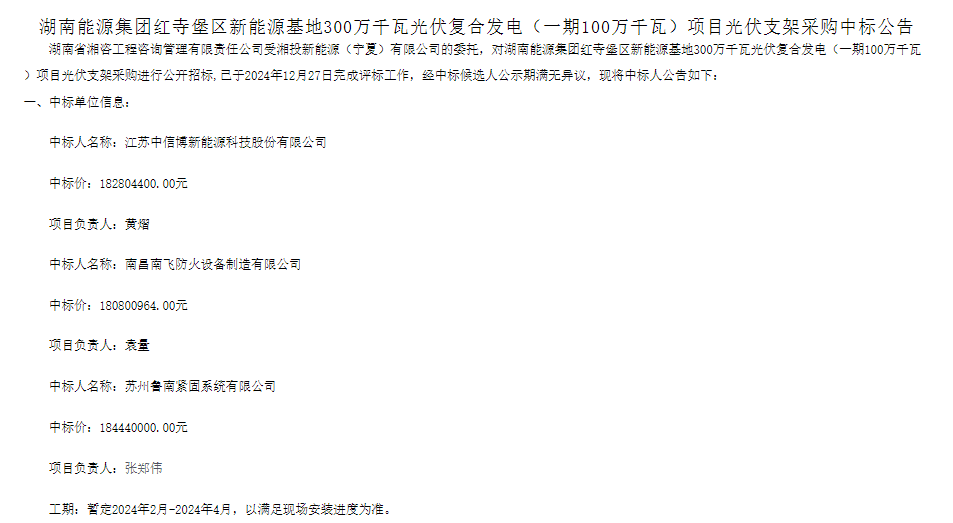 根据公告,共有三家企业中标本项目,分别为江苏中信博新能源科技股份有限公司,中标价182804400元;南昌南飞防火设备制造有限公司,中标价180800964元;苏州鲁南紧固系统有限公司,中标价184440000元。